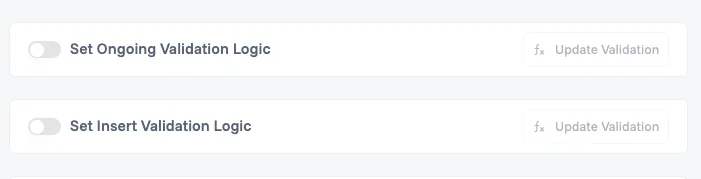 Set Insert Validation Logic validates data only when new records are first created. Use this for rules that should apply during creation but may be relaxed for updates. For example, you might require a field during creation but allow it to be empty in historical records.